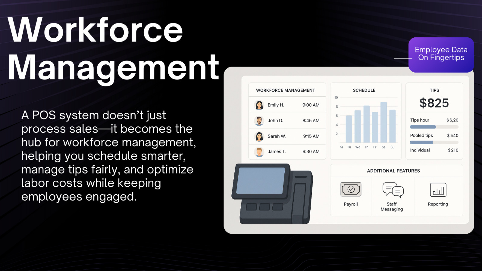 Time clock, breaks, tip pooling, overtime rules, PTO, direct deposit, payroll exports.